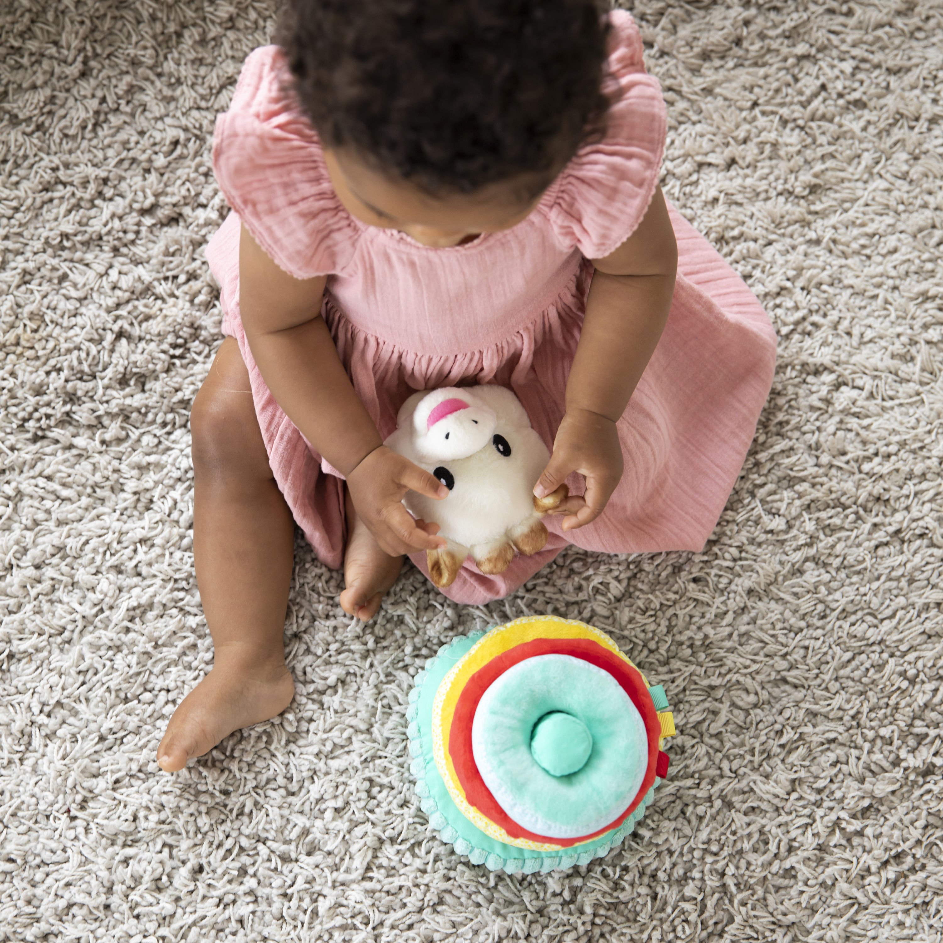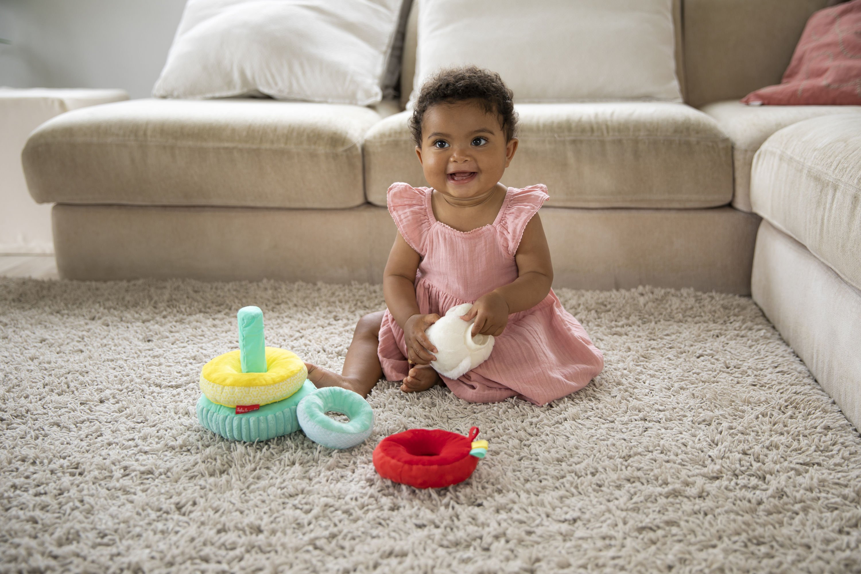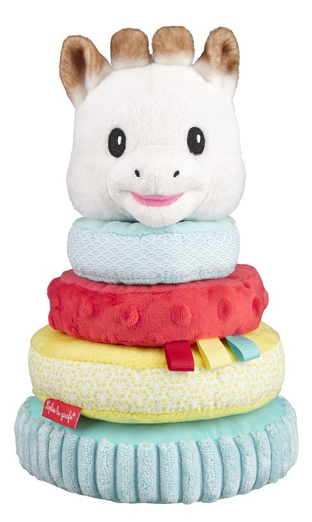 Η υφασμάτινη πυραμίδα της Σόφι αποτελείται από 4 αφρώδες κρίκους διαφορετικών μεγεθών, είναι πάρα πολύ απαλή στην υφή, εύκολη στο πιάσιμο και στον χειρισμό! Παίζοντας με την πυραμίδα, αναπτύσσει την δεξιοτεχνία του, την επιδεξιότητα, την λεπτή κινητικότητα και αντιλαμβάνεται την έννοια του "μεγάλου" και του "μικρού" Θα ξετρελλαίνεται να βάζει και να βγάζει το κεφάλι της Σόφι στην κορυφή της πυραμίδας το οποίο είναι και αυτό λούτρινο και μπορεί να το παίρνει μαζί του για παρέα. Πάνω στους κρίκους έχει πολλές δραστηριότητες να ανακαλύψει: ένα κουδούνι, διάφορες υφές, κορδελίτσες και ήχο τσαλακωμένου χαρτιού.