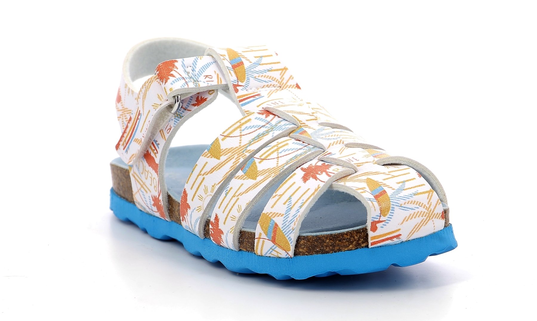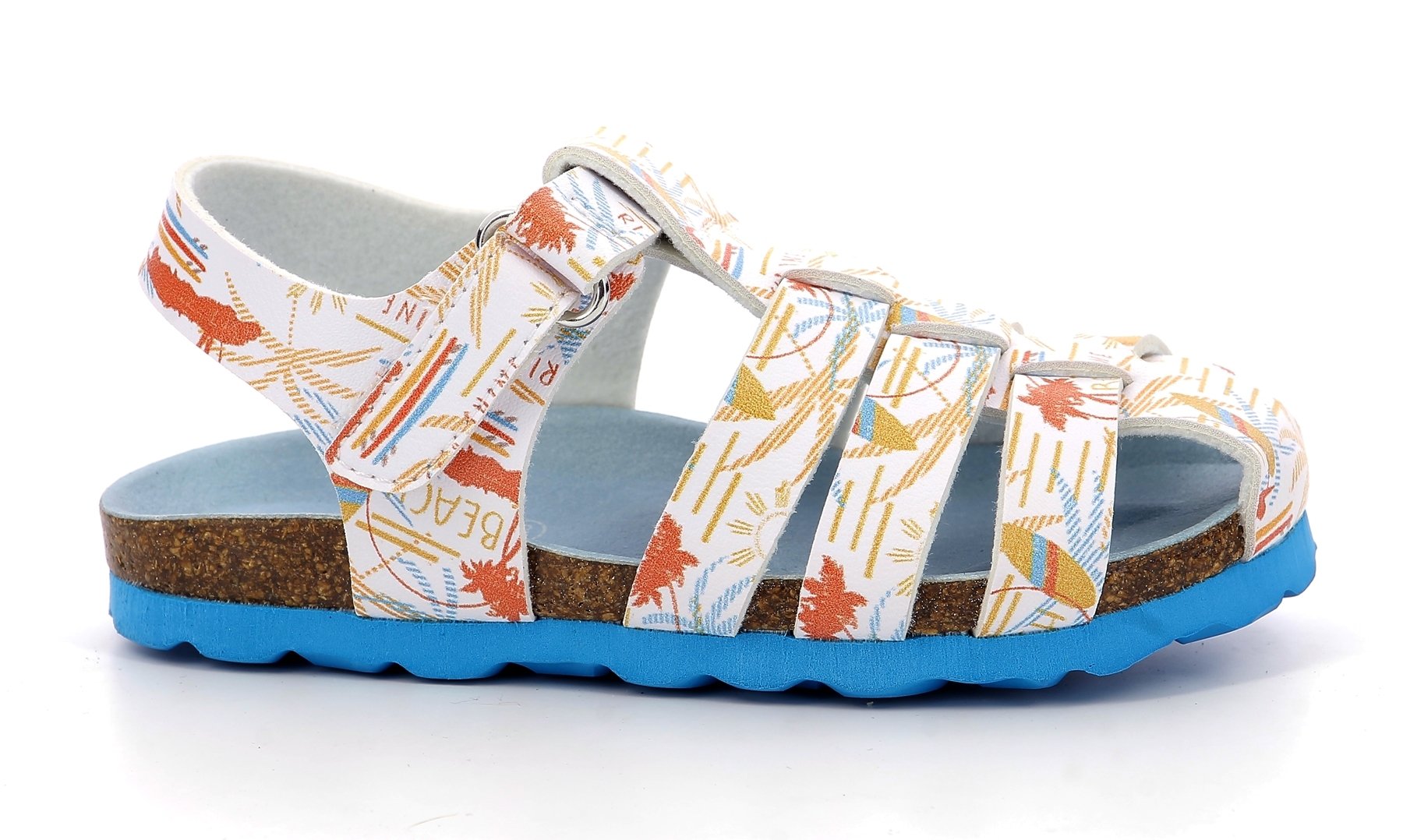 Βρεφικά Παπουτσοπέδιλα για Αγόρια της γαλλικής εταιρίας Kickers. Είναι σε λευκό χρώμα με διάφορα καλοκαιρινά σχεδιάκια στο πάνω μέρος και η σόλα τους είναι σε μπλε χρώμα. Τα παπούτσια Kickers είναι γνωστά για την υψηλή ποιότητά τους και την ανατομική σχεδίασή τους, προσφέροντας άνεση και σταθερότητα στα παιδιά κατά τη διάρκεια των καθημερινών δραστηριοτήτων τους, αλλα και των πιο επίσημων περιστάσεων.